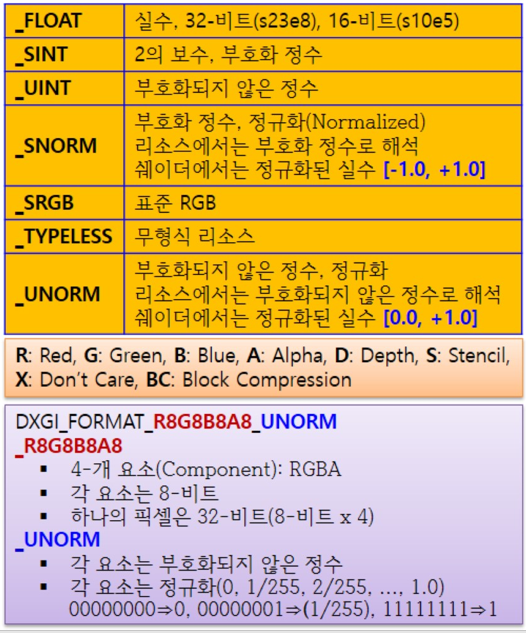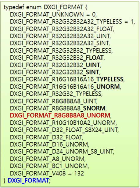 텍스처에는 아무 자료나 담을 수 있는 것은 아니다. 텍스처에는 특정 형식(format)의 자료 원소들만 담을 수 있는데, 구체적인 형식은 DXGI_FORMAT이라는 열거형으로 지정한다. 자료 원소 형식들을 나열하면 다음과 같다.