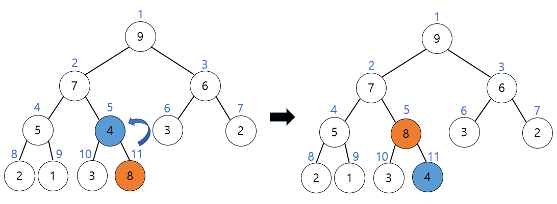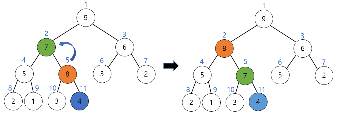 그리고 부모 노드 7과 비교하여 삽입된 요소 8이 더 크므로 교환한다.