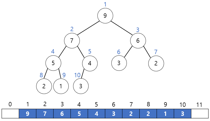 힙은 완전이진트리이기 때문에 중간에 비어있는 요소없이 차례대로 번호를 붙일 수 있다. 이 번호를 배열의 인덱스로 생각하면 배열에 힙의 노드들을 저장할 수 있다. 따라서 힙을 저장하는 효과적인 자료구조는 배열이다. 트리의 모든 위치의 노드 번호는 새로운 노드가 추가되더라도 변하지 않는다. 예를들어 루트 노드의 왼쪽 자식의 번호는 항상 2이며 오른쪽 자식은 항상 3이다.
