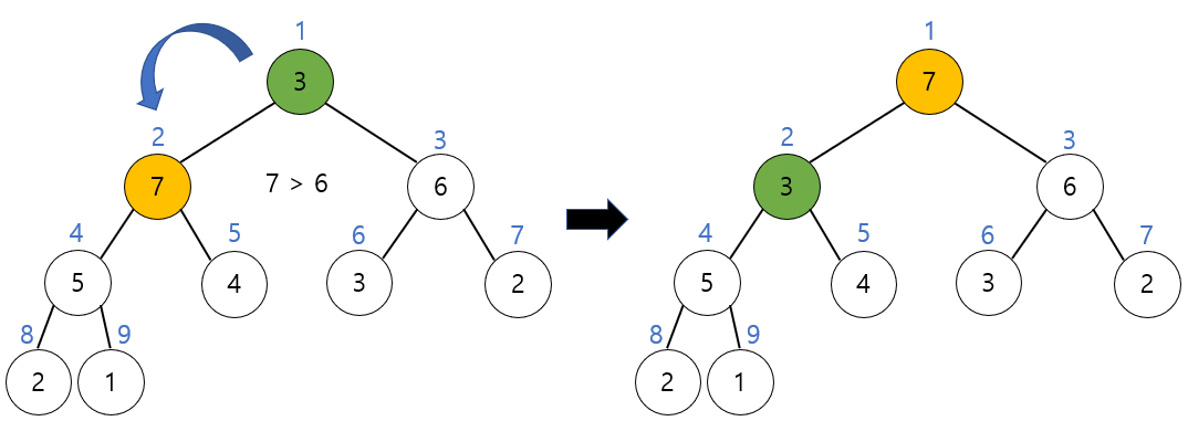 새로운 루트노드인 3과 자식 노드들을 비교해보면 자식 노드가 더 크기 때문에 교환이 일어난다. 이때, 자식 중에서 더 큰 노드와 비교하고 교환해야 함에 유의하자. 따라서 3과 7이 교환된다.