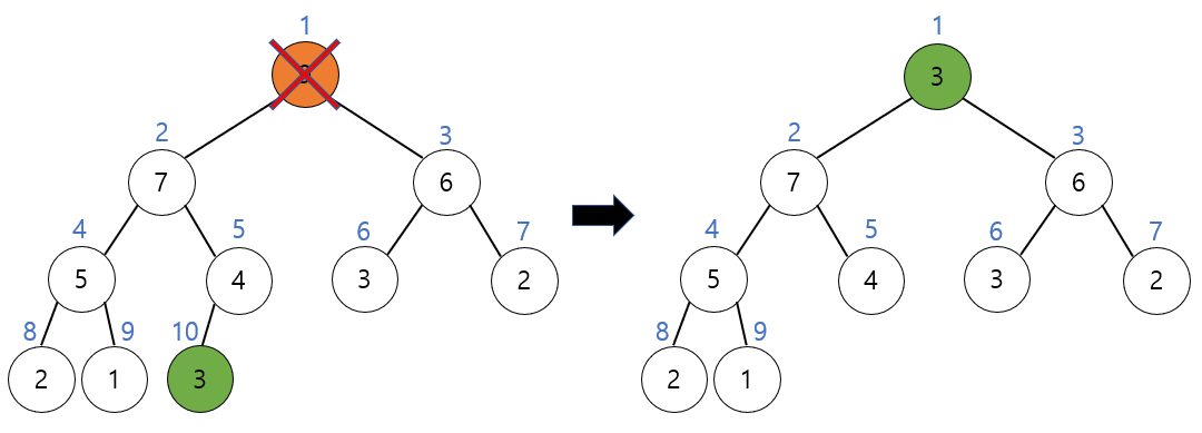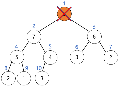 다음 힙 트리에서 루트 노드를 삭제해 보자.
