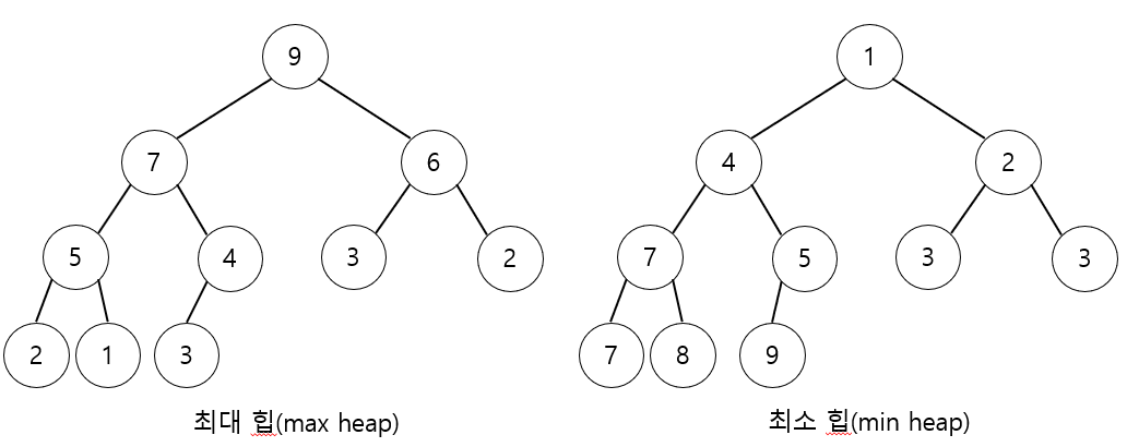 위 그림은 두 가지 종류의 힙 트리를 보여준다. 부모 노드의 키값이 자식 노드보다 큰 경우를 최대 힙(max heap)이라 부르고, 반대로 부모의 키 값이 자식보다 작은 것은 최소 힙(min heap)이라 부른다.