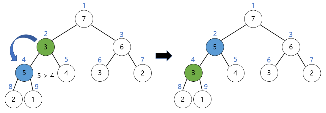 교환된 이후에도 3이 자식 노드보다 더 작기 때문에 3과 자식 노드 5를 교환한다.