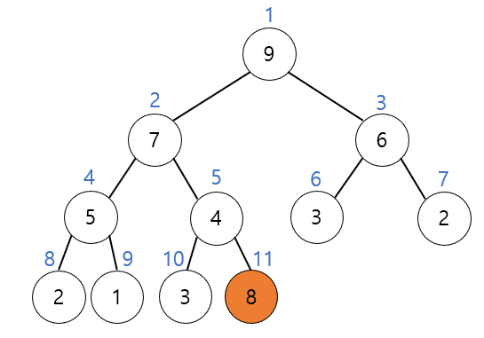 예를 들어 위 트리에서 8을 삽입한다고 하자. 우선 번호순으로 가장 마지막 위치에 이어서 새로운 요소 8이 삽입된다.
