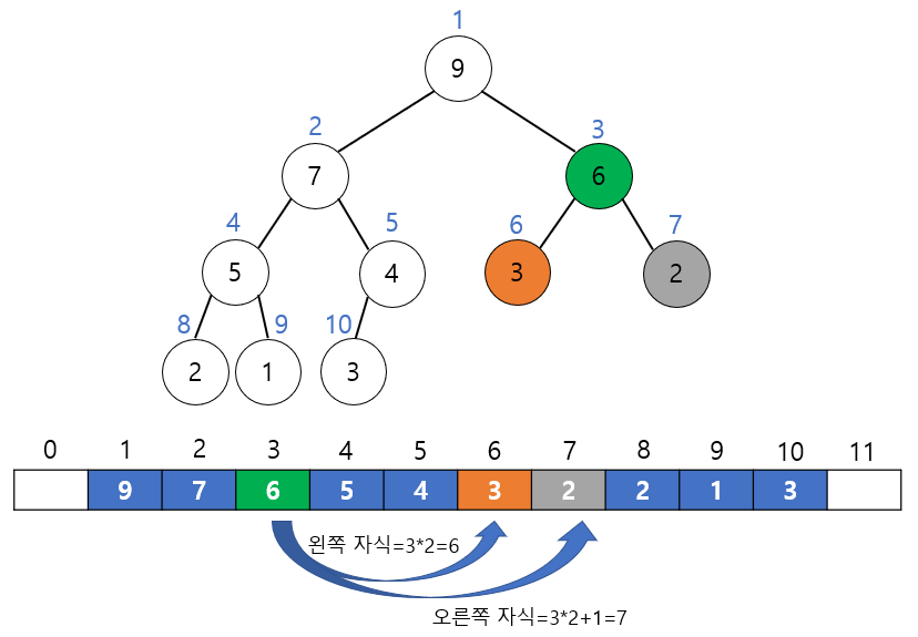 오른쪽 자식의 인덱스 = (부모의 인덱스) * 2 + 1