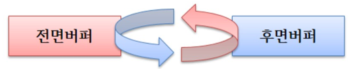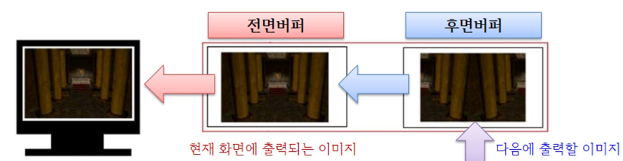 이러한 현상들을 피하고자 사용하는 방법이 바로 2개의 프레임 버퍼를 이용하는 것이다. 2개의 프레임 버퍼는 각각 화면 바깥의 텍스처인 후면 버퍼(Back Buffer)와 화면에 직접 표시되는 전면 버퍼(Front Buffer)를 뜻한다. 완전한 한 프레임을 후면 버퍼에 그리고 이전 프레임을 표현했던 전면 버퍼와 후면 버퍼의 역할을 맞바꾸게 된다. 이렇게 하면 화면을 보는 사용자에게는 프레임이 그려지는 과정이 나타나지 않는다. 사용자는 그저 완성된 프레임만을 볼 뿐이다. 이러한 기법을 더블 버퍼링(Double Buffering)이라고 부른다.