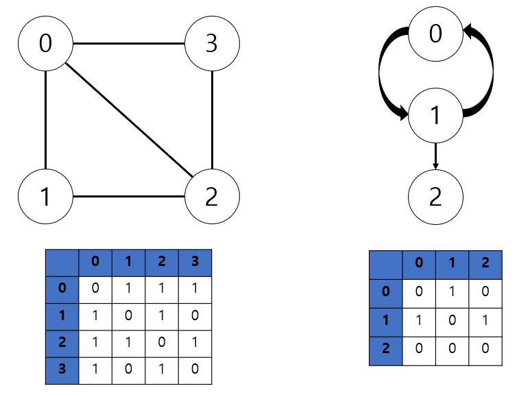우리가 다루는 그래프에서는 자체 간선(자신에서 출발해서 자신으로 들어오는 간선)을 허용하지 않으므로 인접 행렬의 대각선 성분은 모두 0으로 표시한다.