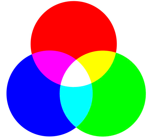 위 그림에서 적, 녹, 청색광을 섞었을 때 나오는 여러 가지 색상의 예가 나와 있다. 또한 빛의 세기(intensity)에 따라서 더 다양한 색을 표현할 수도 있다. 이렇게하여 사실적인 이미지를 표시하는 데 필요한 모든 색상을 묘사할 수 있다. 적(red), 녹(green), 청(blue) 세 가지 색상 성분을 통칭해서 RGB라고 부른다.
