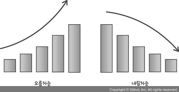 정렬은 순서가 없는 사물들을 순서대로 재배열하는 것을 뜻한다. 순서에는 오름차순(ascending order)과 내림차순(descending order)이 있다. 다음 그림은 순서대로 오름차순과 내림차순의 예시를 보여준다.