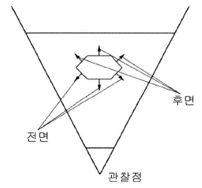 물체를 구성하는 삼각형들의 법선이 항상 물체의 바깥쪽을 향하도록 물체의 모형을 만든다고 가정하자. 그러면 카메라에는 다면체의 후면 삼각형들이 보이지 않는다. 후면 삼각형들은 모두 전면 삼각형들에 가려지기 때문이다. 그래서 후면 삼각형은 그릴 필요가 전혀 없으므로 파이프라인에서 후면 삼각형을 골라서 폐기하는 공정을 후면 선별(backface culling)이라고 부른다. 후면선별을 하면 파이프라인이 처리해야 할 삼각형의 수가 절반으로 줄어들 수 있다.