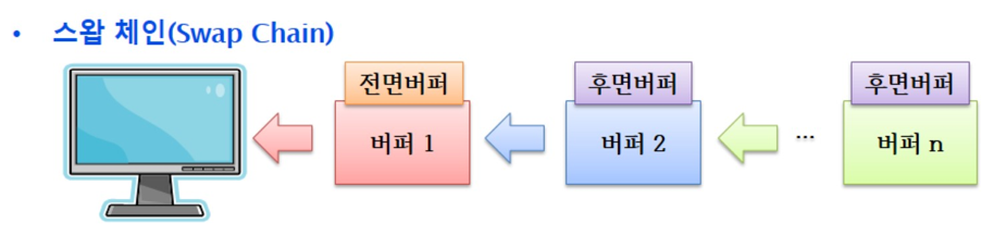 플리핑을 위해서 Direct3D에서는 전면 버퍼와 후면 버퍼 사이의 스왑 체인(Swap Chain)을 형성하고 있다. 스왑 체인은 순차적으로 연결된 프레임 버퍼들의 집합이라고 표현할 수 있다.