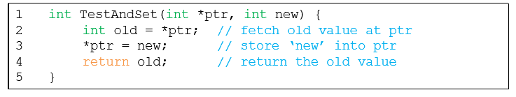 ptr이 가리키는 이전 값을 old로 받아 리턴(TEST)한다. 동시에 그 값을 new로 바꾼다(SET). 이 동작은 원자적으로 수행되어야 하며 중간에 인터럽트 될 수 없다. 때문에, 소프트웨어 만으로는 구현이 불가능하다. 하드웨어 선에서 메모리를 통과하는 버스를 잠가 다른 CPU나 코어의 메모리 관련 명령어 실행을 원천 봉쇄한다.