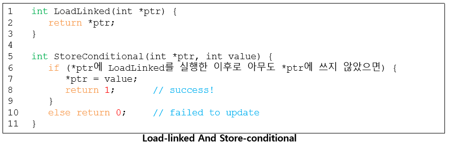 LoadLinked는 메모리 값을 레지스터에 저장한다. store-conditional 명령어는 동일한 주소에 다른 스토어가 없었던 경우에만 저장을 성공한다. 저장이 성공하면, LoadLinked가 탑재했던 값을 갱신한다. 성공한 경우 1을 반환하고 ptr이 가리키는 value값을 갱신한다. 실패한 경우에는 ptr이 가리키는 value의 값이 갱신되지 않고 0을 반환한다.