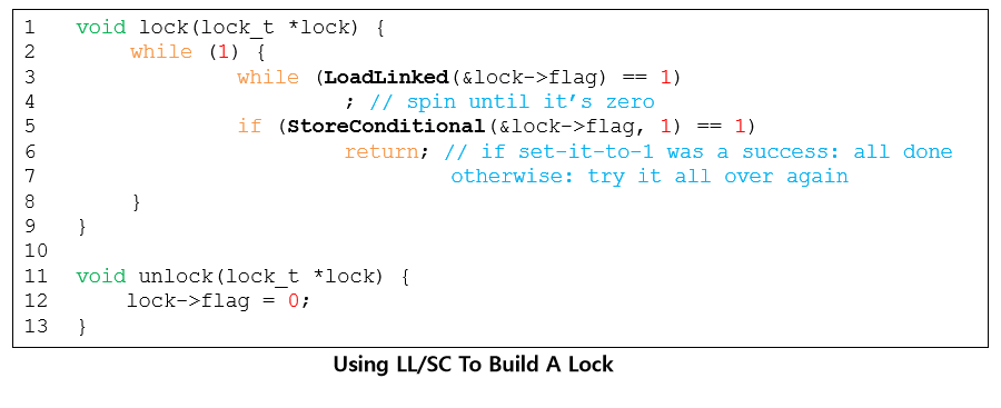 StoreConditional 명령어는 실패할 수도 있다. 이 점이 중요하다. 쓰레드가 lock을 호출하여 LoadLinked를 실행하고 락이 사용 가능한 상태이므로 0을 반환한다. StoreConditional 명령어를 시도하기 전에 이 쓰레드는 인터럽트에 걸렸고 다른 쓰레드가 락 코드를 호출하고 LoadLinked 명령어를 실행하여 0을 반환받은 후 계속 진행한다고 해 보자. 이 시점에서 두 쓰레드는 모두 LoadLinked 명령어를 실행하였고 각자가 StoreConditional을 부르려는 상황이다. 이 명령어의 주요 기능은 오직 하나의 쓰레드만 flag 값을 1로 설정한 후에 락을 획득할 수 있도록 하는 것이다. 두 번째로 StoreConditional을 실행하려는 쓰레드는 락 획득에 실패하고 다음 기회를 기다려야 한다.