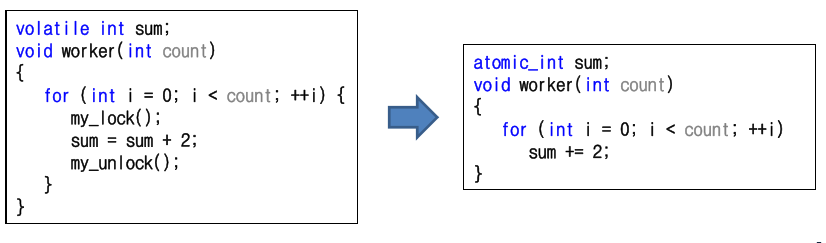 C++ 코드를 보면 atomic_int이 보일 것이다. 이건 무엇일까? C++11부터 지원하는 Atomic 자료구조이다. 이것은 기본 자료 구조의 일부를 원자적으로 구현해놓은 것이다.(char, int, short, bool) Atomic 자료구조를 사용하기 위해서는 <atomic> 라이브러리를 추가해야 한다. Atomic 자료구조는 읽기와 쓰기, 각종 연산(+=, -=, ++, --)을 원자적으로 수행한다.
