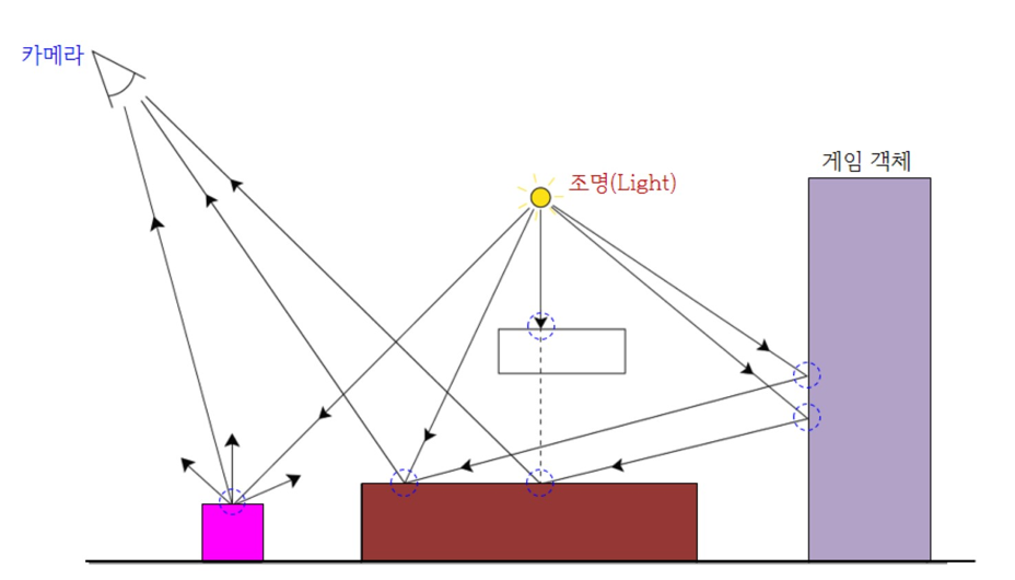 광원에서 나온 빛이 물체와 충돌하면, 그 빛의 일부는 흡수되고 일부는 반사된다. 반사된 빛은 새로운 경로를 따라 이동하다가 다른 물체와 부딪힐 수 있으며, 그러면 또다시 반사와 흡수가 일어난다. 그 중 광원의 일부가 관찰자의 눈에 도달해서 물체를 볼 수 있게 된다.