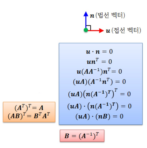 접선 벡터 u가 행렬 A로 변환되면 변환된 접선 벡터는 uA가 된다. 따라서 접선 벡터에 수직인 법선 벡터 n은 n(A^-1)^T (즉 A의 역행렬의 전치행렬, 역전치행렬)로 변환된다.