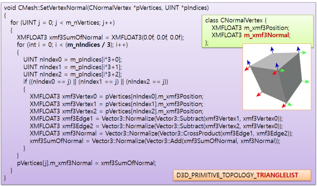 이 기법에서 법선들의 평균은 곧 법선들의 합을 정규화해서 얻은 단위 벡터이다. 다음은 삼각형 메시의 정점 목록과 인덱스 목록이 주어졌을 때 이러한 평균 기법을 이용해 정점 법선들을 구하는 방법을 보여주는 코드이다.