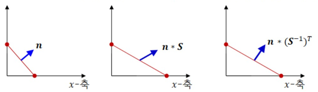 다음 그림과 같이 정점이 변환되는 경우 법선 벡터도 변환되어야 한다.
