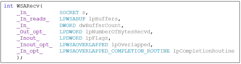 WSARecv 함수는 연결된 소켓으로부터 데이터를 읽는 역할을 한다. lpOverlapped 포인터가 NULL이면 동기식, 실제 포인터이면 비동기 방식으로 실행된다. lpCompletionRoutine에 함수를 적어주면 비동기 CallBack 방식으로 동작한다. CallBack 방식은 비동기 I/O의 완료 여부를 일일이 검사하지 않아도 자동적으로 처리해준다. 이는 곧 오버헤드 감소로 인한 성능 향상으로 이어진다. CallBack 함수는 운영체제가 호출한다. 하지만 실행 중인 프로세스를 멈추고 실행하지는 않는다. 프로세스가 운영체제를 호출했을 경우 운영체제에서 리턴 시 추가로 수행한다.