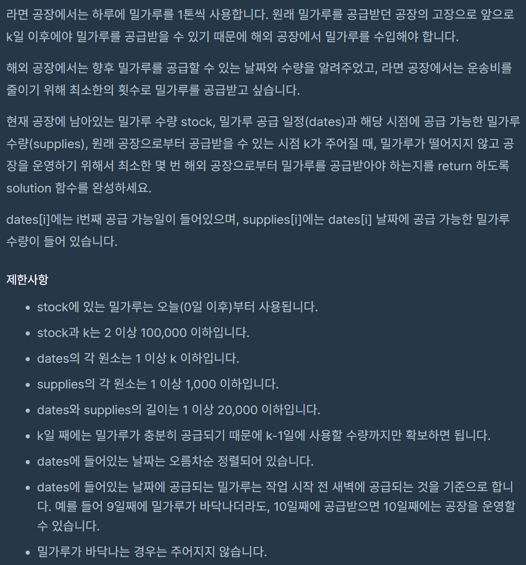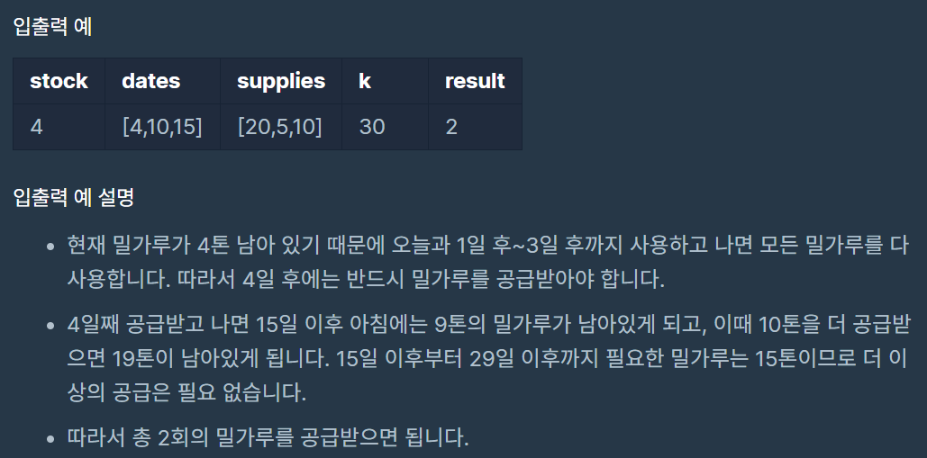 공급 받을 날짜가 되면 그 날짜의 밀가루 수량을 힙에 추가한다. (여기서 힙은 최대힙)