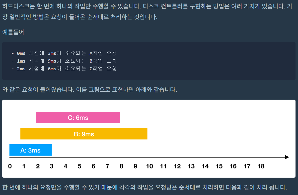 하드디스크가 작업을 수행하고 있지 않을 때에는 먼저 요청이 들어온 작업부터 처리합니다.