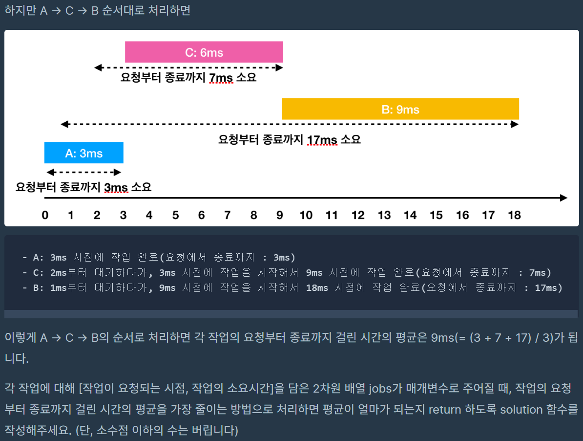 평균 시간이 가장 최소가 되기 위해서는 각 작업 소요시간 순으로 처리하면 된다. 여기에는 요청이 먼저 들어온 순서도 고려를 해줘야 한다.