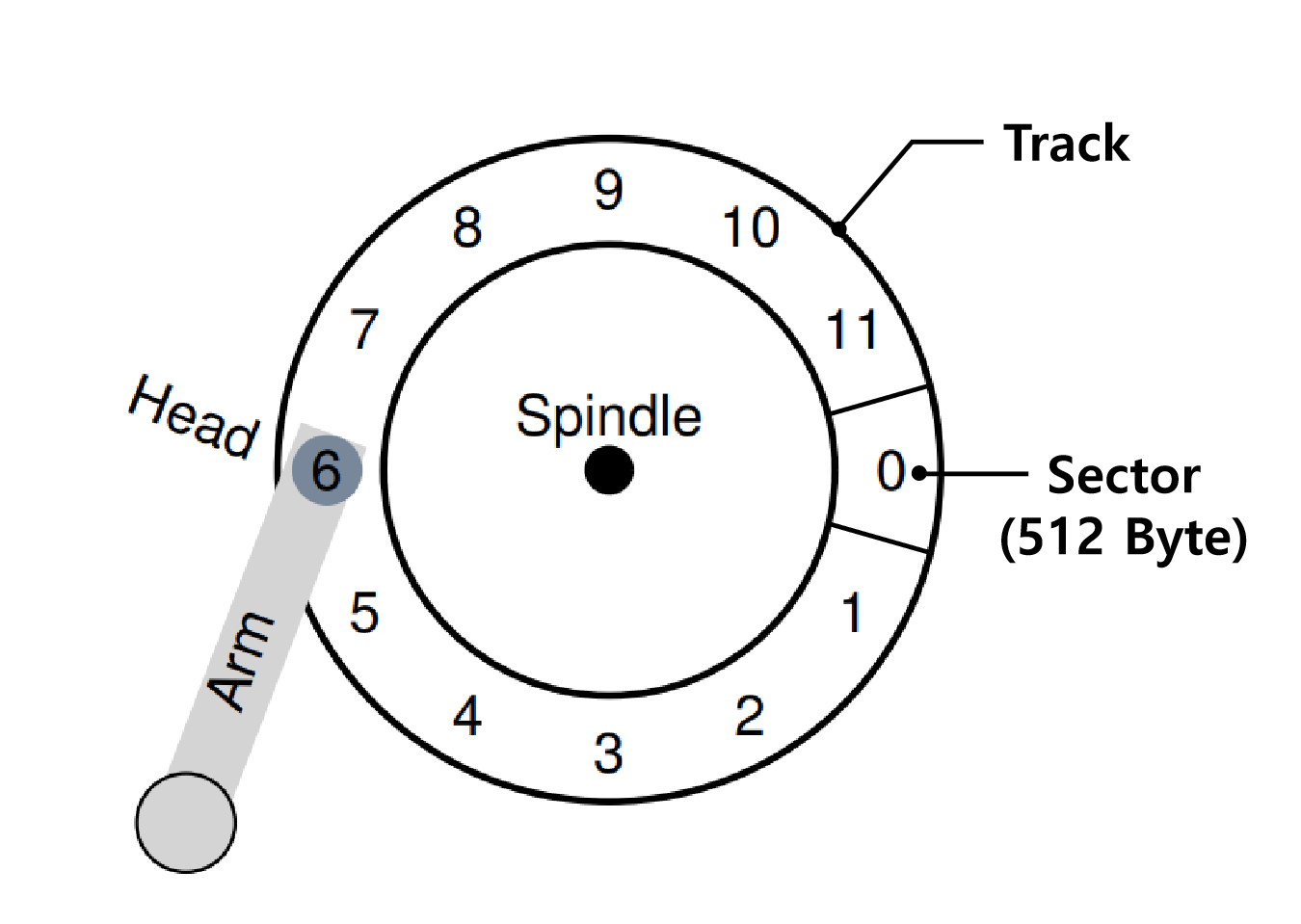 이 트랙에서는 12개의 섹터가 있고 각 섹터는 512Byte의 크기를 가지고 있으며, 주소 영역은 0부터 11까지로 이루어져 있다. 모터에 연결된 회전축을 중심으로 플래터가 회전한다. 섹터에 무언가 읽거나 쓰고 싶을 것이기 때문에 다음 그림과 같이 디스크 암에 붙어 있는 디스크 헤드가 필요하다.