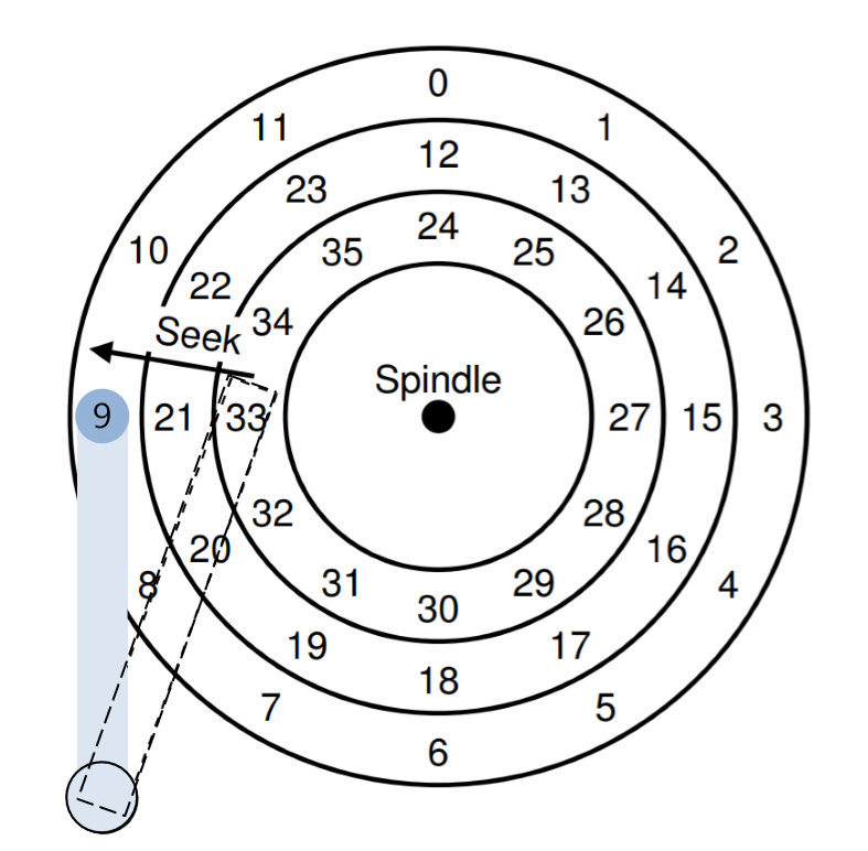 이러한 간단한 디스크의 경우 그렇게 많은 일을 할 필요가 없다. 디스크 헤드 아래에 원하는 섹터가 위치하기를 기다리면 된다. 이런 기다림은 현대 드라이브에서도 흔히 발생하며 I/O 서비스 시간에서 중요한 요소이기 때문에 회전형 지연(rotational delay)이라는 특별한 이름을 가지고 있다.