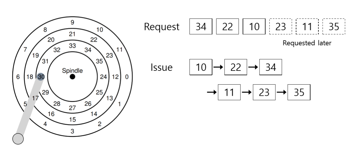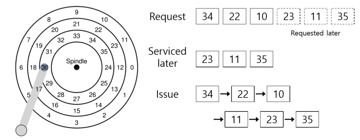 이 예에서는 헤드가 현재 가장 안쪽의 트랙의 섹터 30번 위에 위치해있다. 스케줄러는 다음의 요청을 처리하기 위해 중간 트랙의 섹터 16번으로 이동할지 바깥 트랙의 섹터 8번으로 이동할지 결정해야 한다. 다음의 차례는 어떤 것이 되어야 할까?