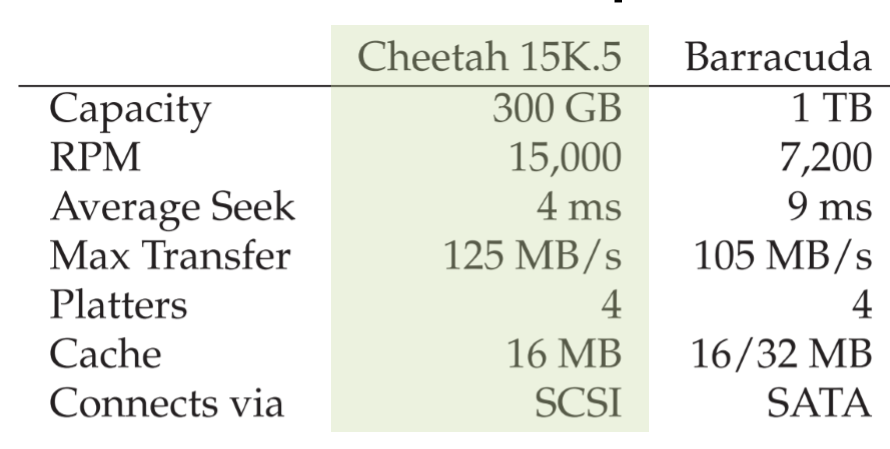 보는 바와 같이 드라이브들은 상당히 다른 특성을 가지고 있고 디스크 드라이브 시장의 두 가지 중요한 요소를 잘 요약하고 있다. 하나는 고성능 드라이브 시장으로 가능한 빠르게 회전하도록 설계되어 낮은 탐색 시간과 빠른 데이터 전송 속도를 가지고 있다. 두 번째는 용량 위주의 시장으로 바이트당 가격이 가장 중요한 측면이라서 드라이브 속도는 낮지만 주어진 공간에 가능한 많은 비트를 저장한다.