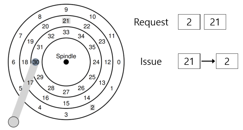 그림에서 보는 것과 같이 디스크 헤드는 디스크 암의 끝에 붙어 있으며 섹터 6번 위에 위치해 있다. 그리고 표면은 시계 반대 방향으로 회전한다.