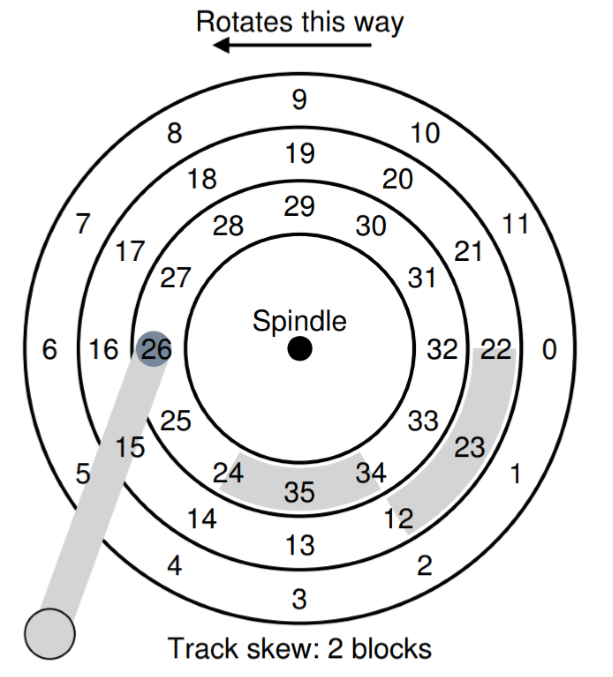 하드 드라이브 동작에 대한 몇 가지 흥미로운 내용을 살펴보자. 많은 드라이브는 트랙 비틀림(track stew)이라 불리는 기술을 채용하여 트랙의 경계를 지나서 순차적으로 존재하는 섹터들을 올바르게 읽을 수 있게 한다. 트랙 비틀림은 다음 그림처럼 나타낼 수 있다.