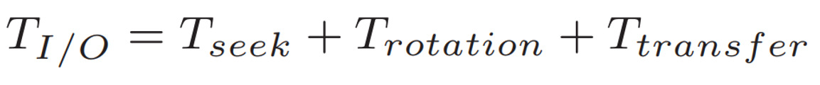 추상화된 디스크 모델을 만들었으니 이제 간단한 분석을 통해 디스크의 성능을 구할 수 있다. 세 개의 항으로 이루어진 다음의 식을 통해 I/O 시간을 나타낼 수가 있다.