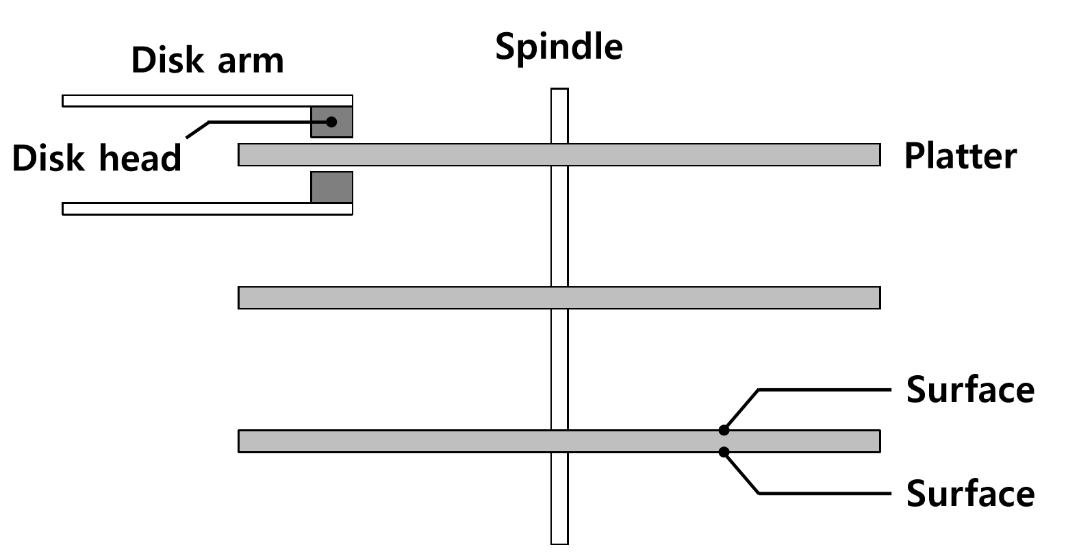 현대 디스크의 주요 요소들을 이해해 보자. 먼저 플래터(platter)라는 것을 살펴보자. 원형의 딱딱한 표면을 갖고 있는 플래터에 자기적 성질을 변형하여 데이터를 지속시킨다. 디스크는 하나 또는 그 이상의 플레터를 가지고 있으며 각각은 2개의 표면(surface)을 가지고 있다. 이런 플래터는 대체적으로 단단한 물질로 만들어지며 드라이브의 전원이 나가도 비트를 드라이브에 영구적으로 저장하기 위해 얇은 자성층이 입혀져 있다.