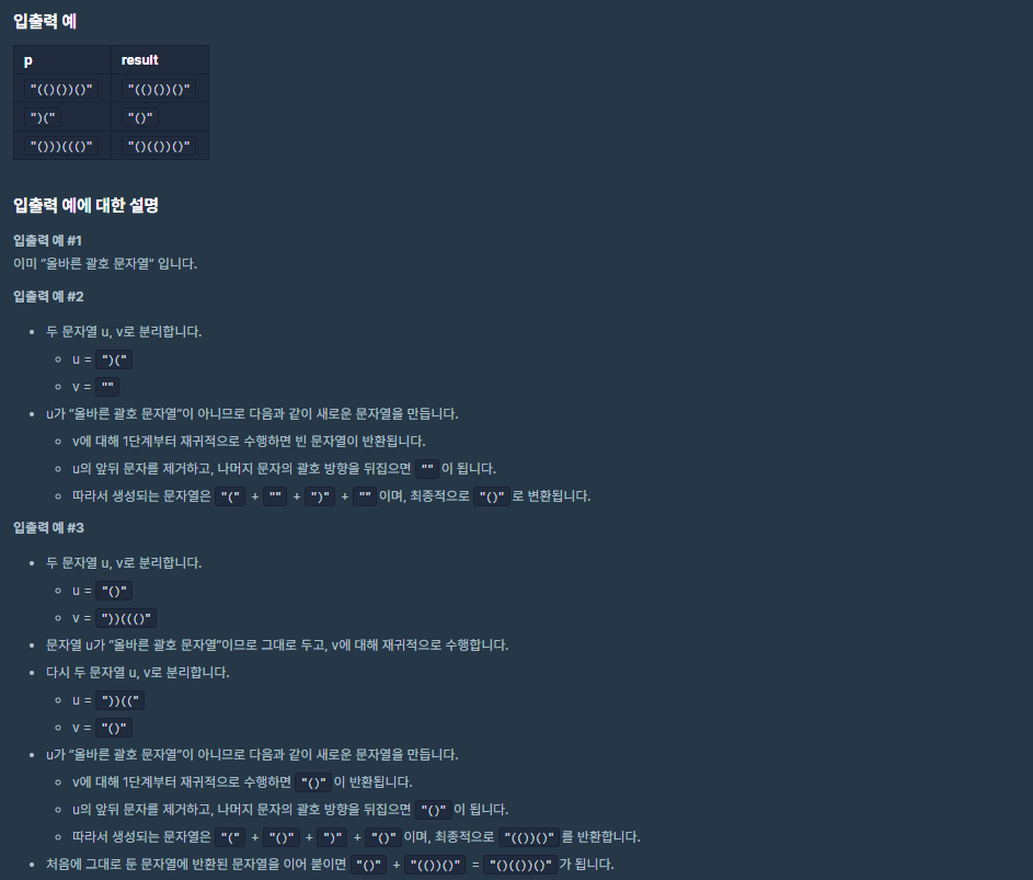v는 위와 똑같이 해주면 된다. u는 맨 앞, 맨 뒤 문자열을 지워준 후, 모든 괄호를 반대 방향으로 바꿔준다. 그리고 "(" + 재귀 과정(v) + ")" + 작업한(u)를 리턴해 주면 된다.