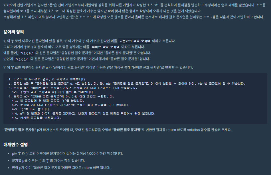이 작업은 스택을 이용하면 좀 더 편하게 검사할 수 있다. u 문자열 전체를 순회돈다. 만약 문자가 '('인 경우, 스택에 넣어준다. 만약 문자가 ')'인 경우, 스택에서 '(' 문자를 꺼내 주면 된다. 만약 '(' 일 때 스택이 비어있다면 그것은 올바르지 않은 괄호이다. 또한 u 전체를 순회한 이후 스택에 문자가 남아있다면 그것도 올바르지 않은 괄호이다.