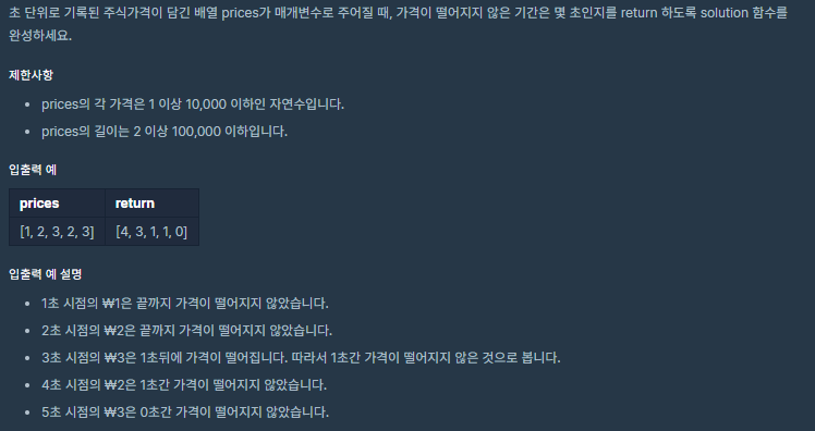 모든 루프를 돌았다. 이제 스택에 남은 시간 값을 처리한다. 이 시간 값의 가격들은 끝까지 가격이 내려가지 않은 경우가 된다.