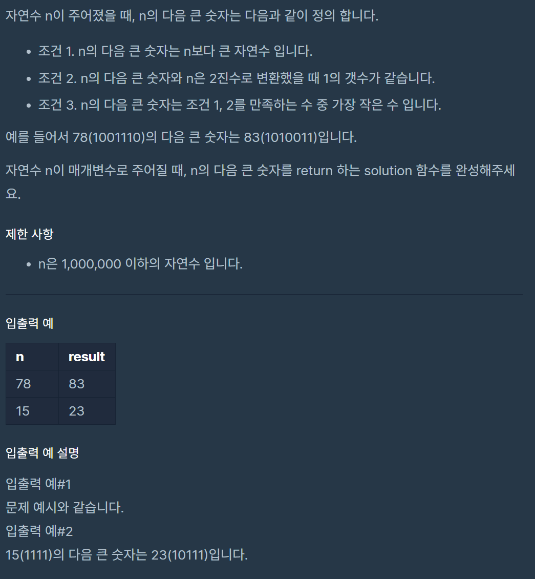 one_count(tmp)가 count와 같다면 위 조건을 만족하는 숫자이므로 정답으로 반환한다.