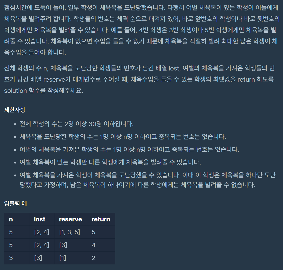 여벌 체육복을 가져온 학생이 도난 당할 수 있다는 점에 주목하자. 이 경우에는 여벌 체육복을 가져왔다고 해도 다른 학생에게 체육복을 빌려줄 수 없다.