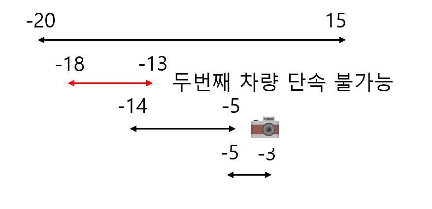 이제 4번째 차량을 살펴보자 3번째 차량 범위와 -5를 맞닿아 있다. 하지만 카메라를 -5로 옮기면 두번째 차량을 단속할 수 없게 된다.