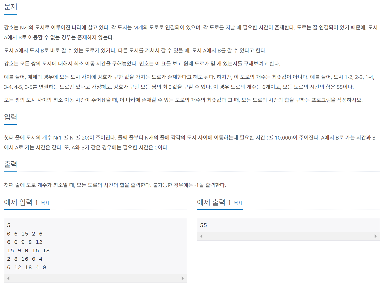 예전에 풀었던 섬 연결하기 문제와 비슷한 줄 알았지만, 도시들이 서로 다른 도시를 가는 길이가 최소가 나오도록 도로를 깔아야 했다.