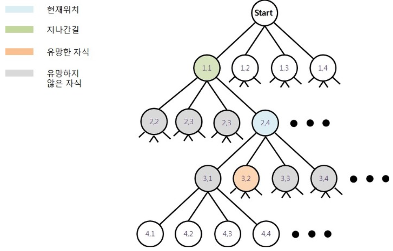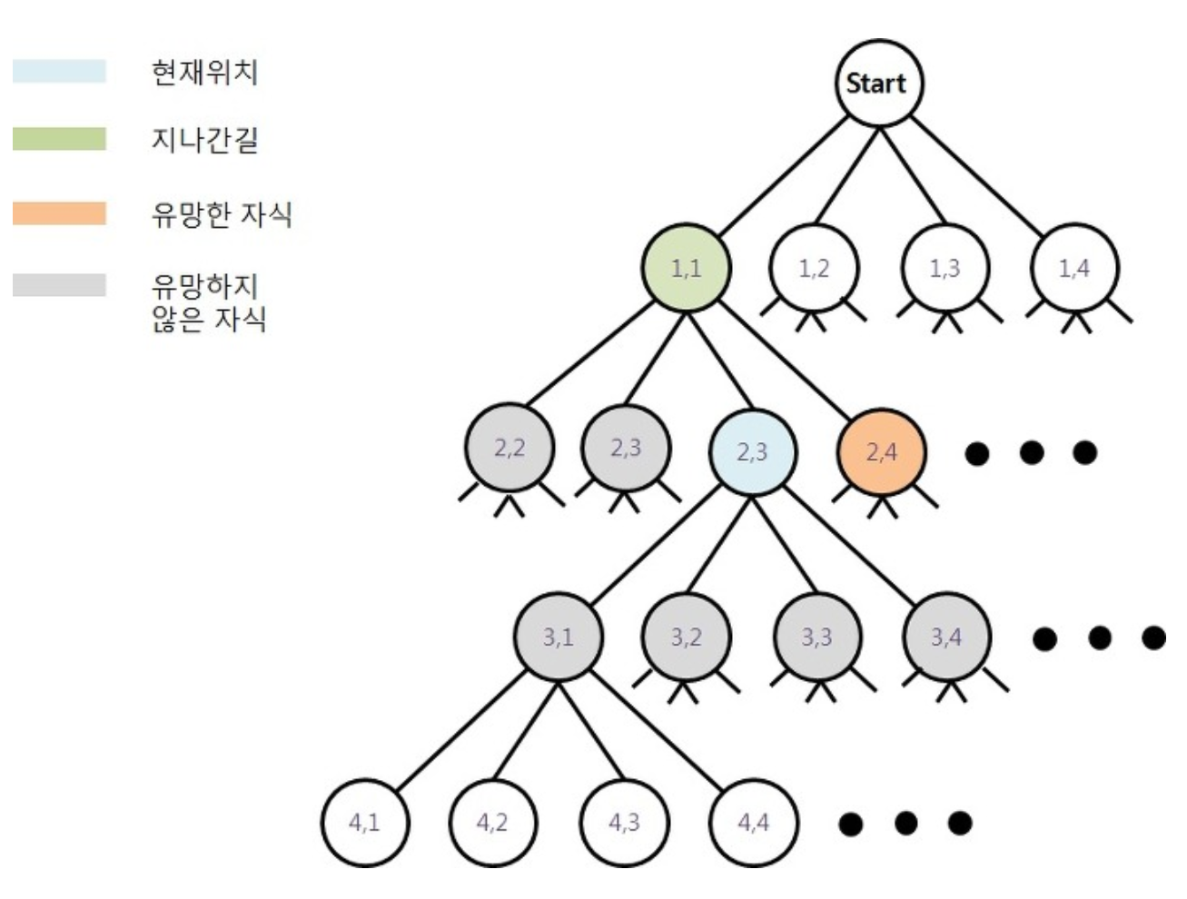 이처럼 백트래킹 해답을 찾는 과정에서 유망한지 즉, 해답이 될 가능성이 있는지를 확인하고 유망하지 않다면, 더이상 깊게 들어가지 않고 부모 노드로 돌아오는 방식을 취한다.