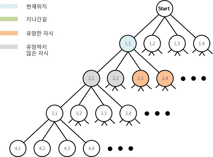 이처럼 백트래킹 해답을 찾는 과정에서 유망한지 즉, 해답이 될 가능성이 있는지를 확인하고 유망하지 않다면, 더이상 깊게 들어가지 않고 부모 노드로 돌아오는 방식을 취한다.