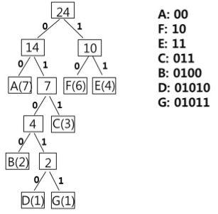 이러한 압축 과정에서 가장 중요한 부분이 각 문자를 표현하기 위한 허프만 트리(Huffman tree)를 구성하는 것인데, 예를 통해 그 과정을 이해해 보자.