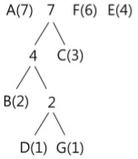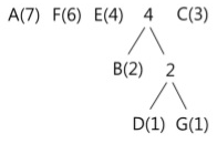 동일한 방법으로 다음 단계를 수행한다. 이번에는 4(B, D, G)와 C(3)이 트리로 묶이게 된다. 이때의 빈도수 합은 7이 되며, 이 값을 기준으로 내림차순 재배열을 수행한다.