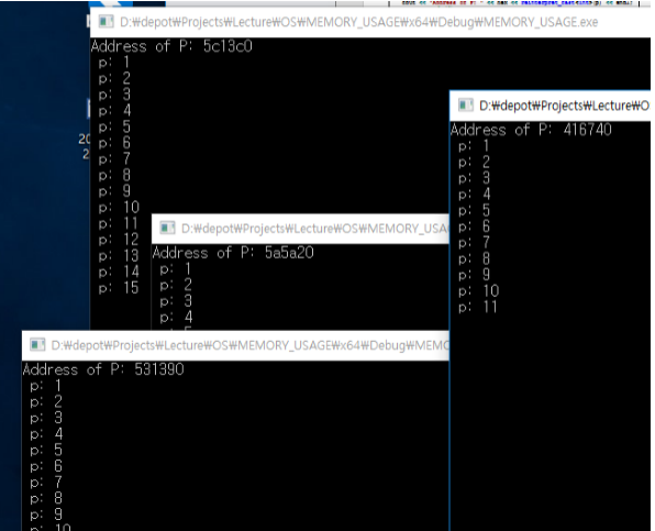 위 결과처럼 나오는 이유는 모든 실행중인 프로그램은 각자 고유의 메모리를 갖고 있기 때문이다. 만약에라도 출력된 주소 값이 서로 같다고 하더라도 프로그램이 다르면 서로 다른 메모리이다.