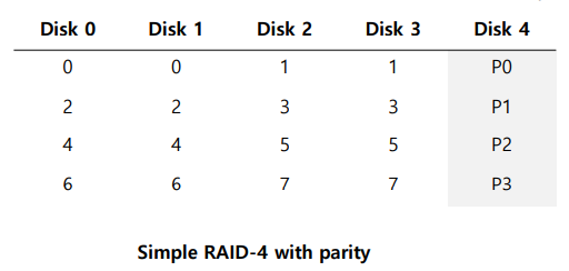 이제 패리티라고 알려진 중복성을 추가하는 다른 방법을 설명한다. 패리티 기반의 접근 방법은 저장 공간을 더 적게 사용하려고 하여 미러링 기반 시스템이 지불하는 엄청난 공간 낭비를 극복하려고 시도한다. 대신 성능이라는 비용을 지불해야 한다.