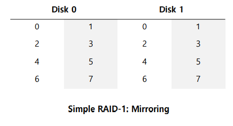 일반적인 미러링 시스템에서 RAID는 각 논리 블럭에 대해 두 개의 물리적 사본을 둔다고 가정한다. 그 예제는 다음과 같다.