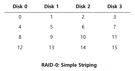 가장 간단한 스트라이핑은 위 그림과 같이 블럭들을 여러 디스크에 걸쳐서 줄을 긋는 것처럼 저장한다. 그림을 보면 기본 개념은 이해할 수 있다. 디스크 배열의 블럭들을 라운드 로빈(RR) 방식으로 디스크를 가로질러 펼치는 것이다. 이 접근법은 배열의 연속적인 청크에 대해 요청을 받았을 때 병렬성을 가장 잘 활용할 수 있도록 설계되어 있다. 같은 행에 있는 블럭들을 스트라이프(stripe)라고 부른다. 따라서 블럭 0, 1, 2, 3은 같은 스트라이프에 존재한다.